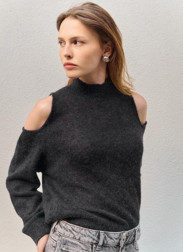 Dieser Pullover verbindet Sinnlichkeit und Gemütlichkeit. Er ist aus einer leichten Alpaka-Wollmischung. Der Pullover hat einen schönen hohen gerippten Stehkragen und lange Ärmel. Das ausgefallene Detail sind die offenen Schultern, die einen Hauch von Haut unter der kuscheligen Wolle preisgeben.