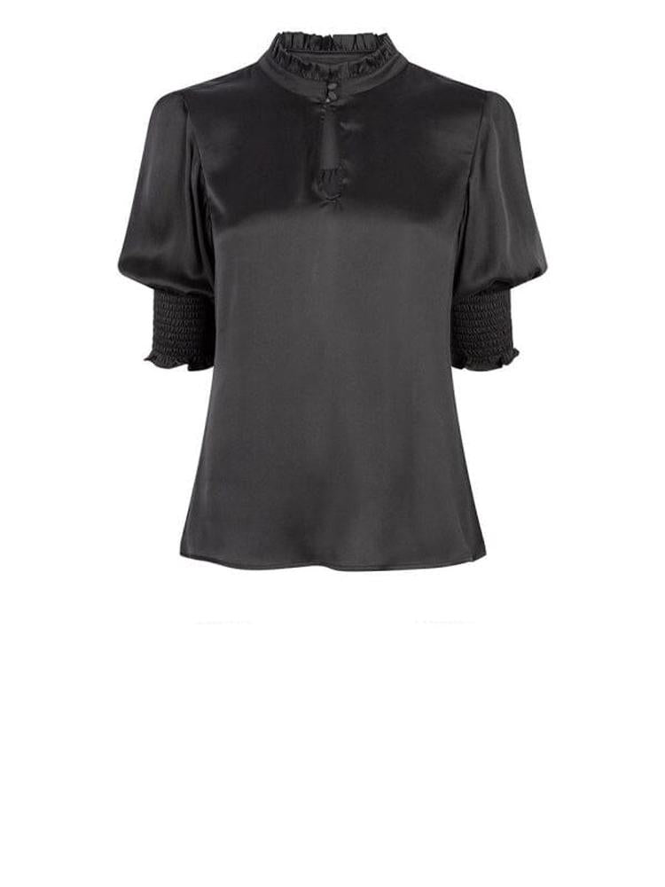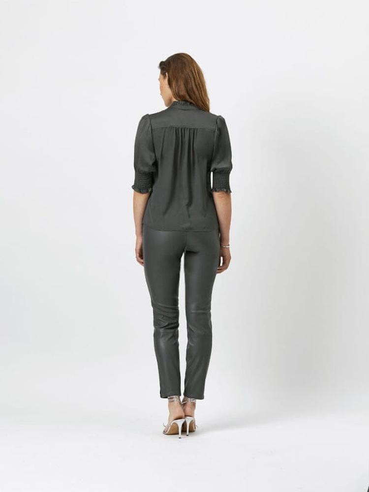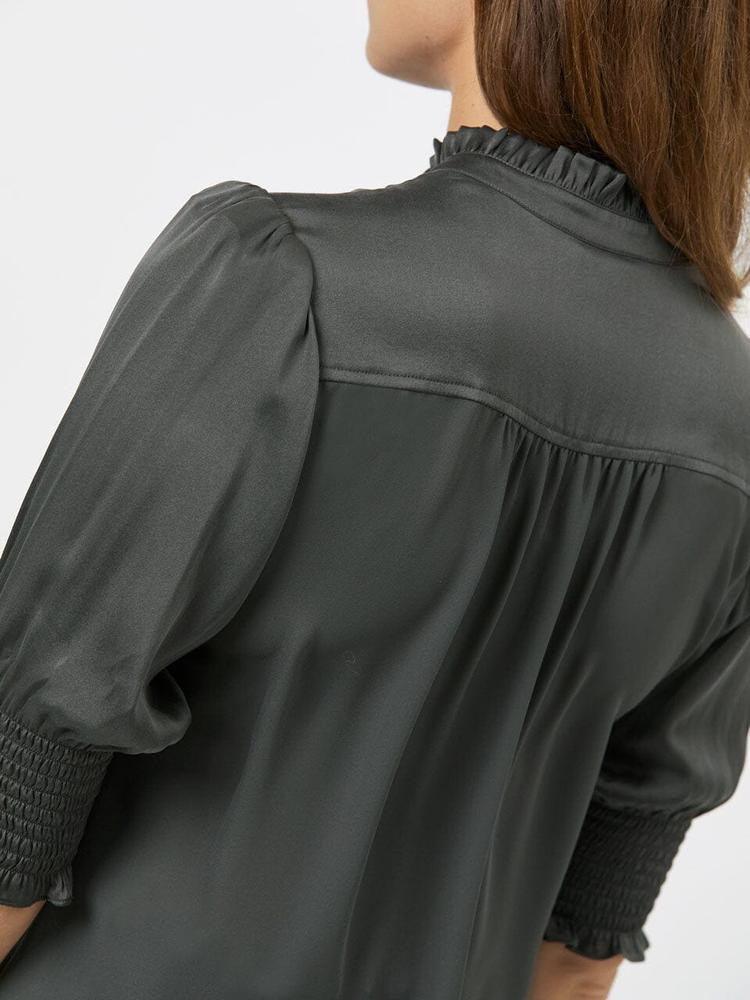 Das Oberteil Allisto in Urban Grey ist aus einer fließenden Seidenmischung und hat einen Rückeneinsatz in Crêpe Georgette. Das Oberteil hat einen Stehkragen mit Rüschenkante und zwei kleine knöpfe als Verschluss. Unterhalb der Knöpfe befindet sich ein dezenter ovaler Ausschnitt. Die Schultern sind mit Kräuseln betont, die Ärmel, die am ellenbogen enden, sind gesmokt und mit einem elastischen bündchen versehen und enden mit einer Rüsche. Trage das Oberteil unter einer Strickjacke, für einen ausgefallenen alltagslook mit einer Jeans- oder Lederhose.