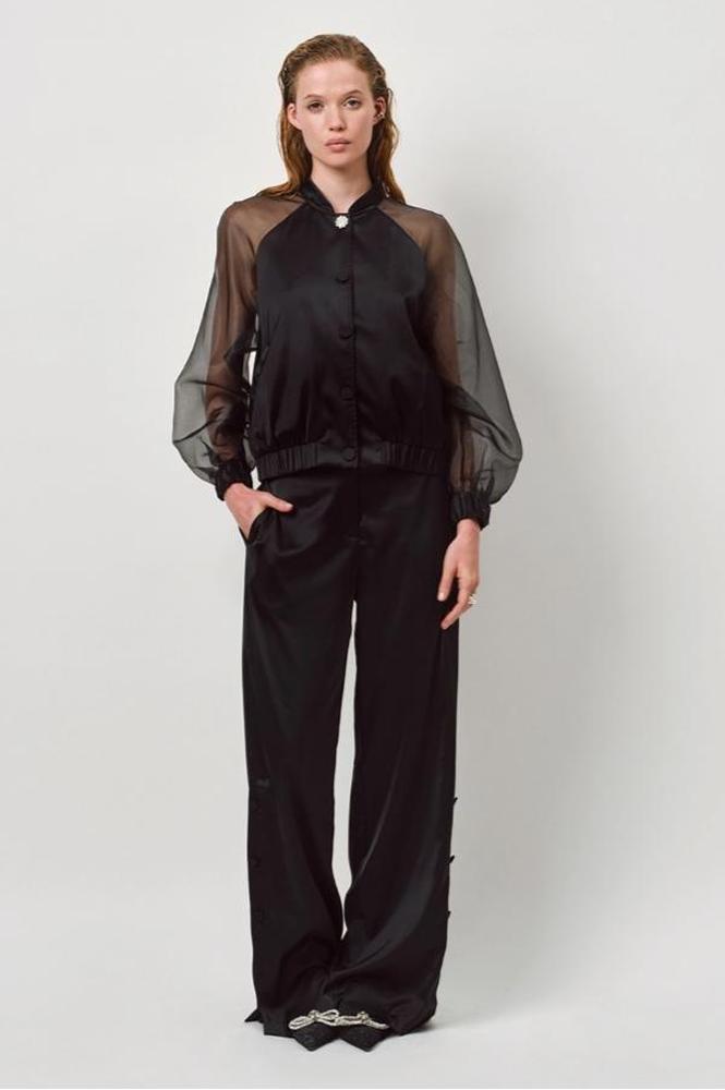 Wenn du die Kombination aus lässig und schick magst, dann ist unsere Bomberjacke Tullya in Black die perfekte Wahl. Diese elegante Bomberjacke ist aus einem Kreppsatin und die Ärmel sind aus Organza. Die Bomberjacke hat eine kurze Passform mit einem elastischen Saum. Die durchsichtigen Ärmel sind ebenfalls mit elastischen Bündchen versehen. Die Knöpfe an der Vorderseite sind mit Stoff bezogen und der oberste Knopf ist ein dekorativer Strassknopf.