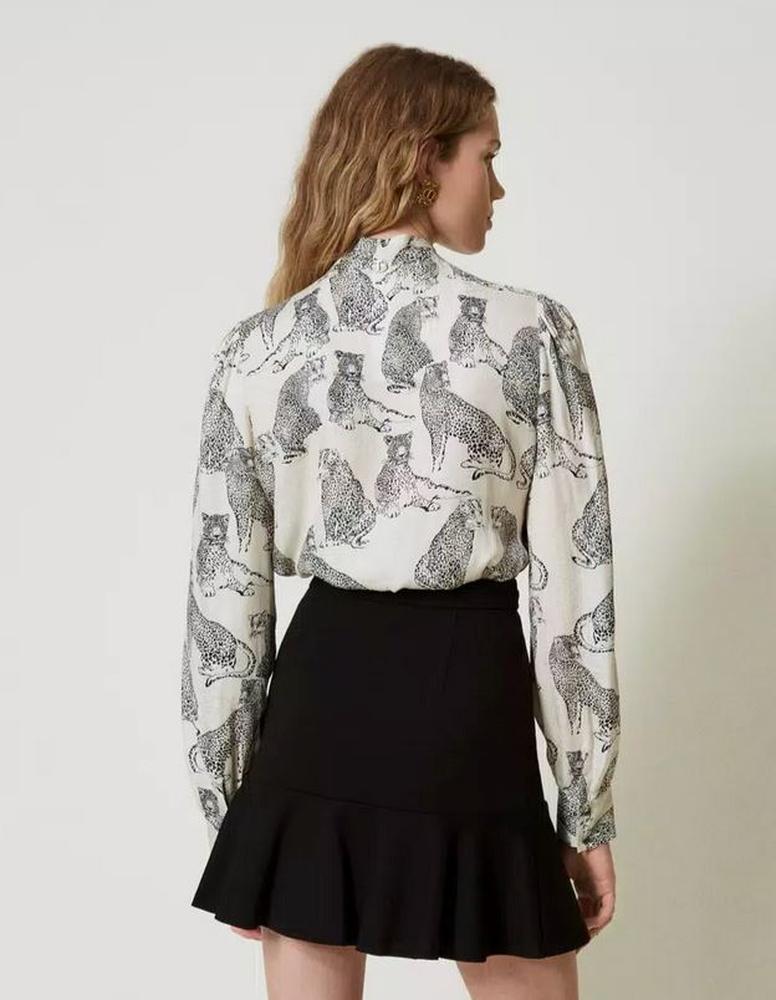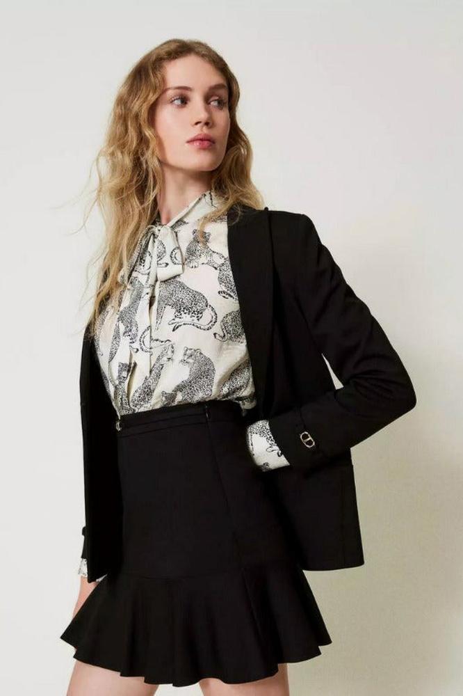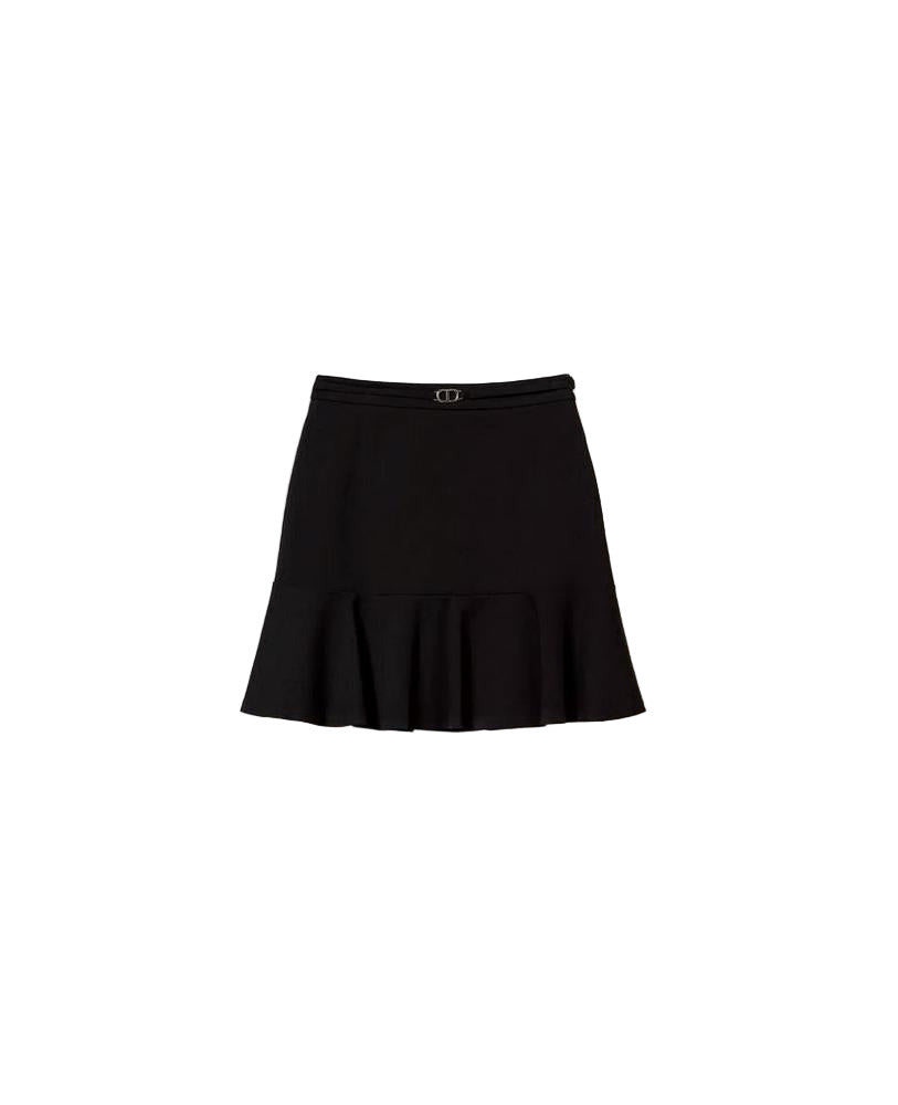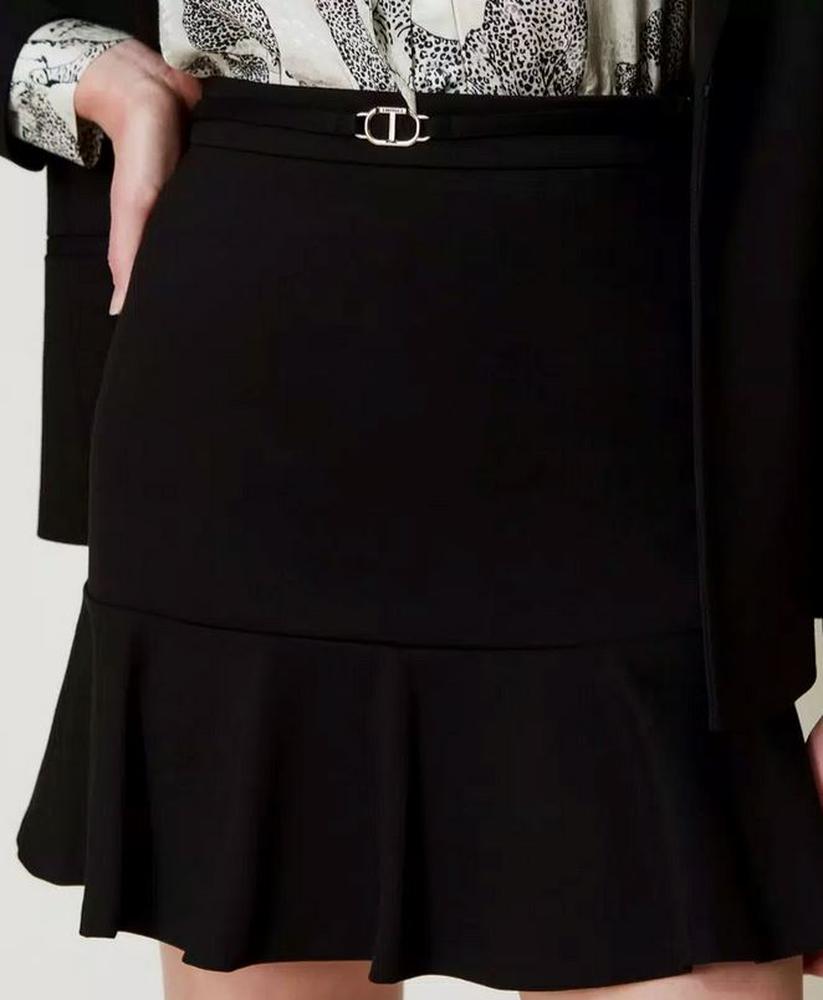 Ausgestellt geschnittener Minirock aus Milano-Strick aus Viskose-Stretch-Mischung mit einem Taillengürtel, Seitenreißverschluss und geradem Schößchen mit Volant an der Unterpartie, der dem Gesamtbild Bewegung schenkt.