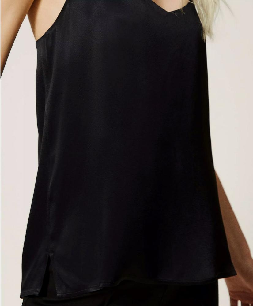 Top aus fließendem Viskosesatin mit tiefem V-Ausschnitt, schmalen Trägern und amerikanischem Ausschnitt am Rücken. Runde deine Styles mit diesem geradlinigen Top aus fließendem Viskosesatin ab. Versehen ist das Modell mit schmalen Trägern, V-Ausschnitt vorne und amerikanischem Ausschnitt. Dieses vielseitige, raffinierte Modell von der Marke Twinset macht sich fantastisch unter Blazern und Cardigans, aber auch ganz Eyecatcher-Top für einen wirkungsvollen Abendlook.