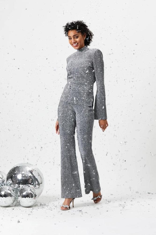 Mach dich bereit, in dieser Hose zu glänzen. Hochgeschnittene silberfarbene Paillettenhose aus Stoff. Der elastische Bund sorgt für Bequemlichkeit. Der schillernde Effekt wird dich zum Mittelpunkt jeder Tanzfläche machen.